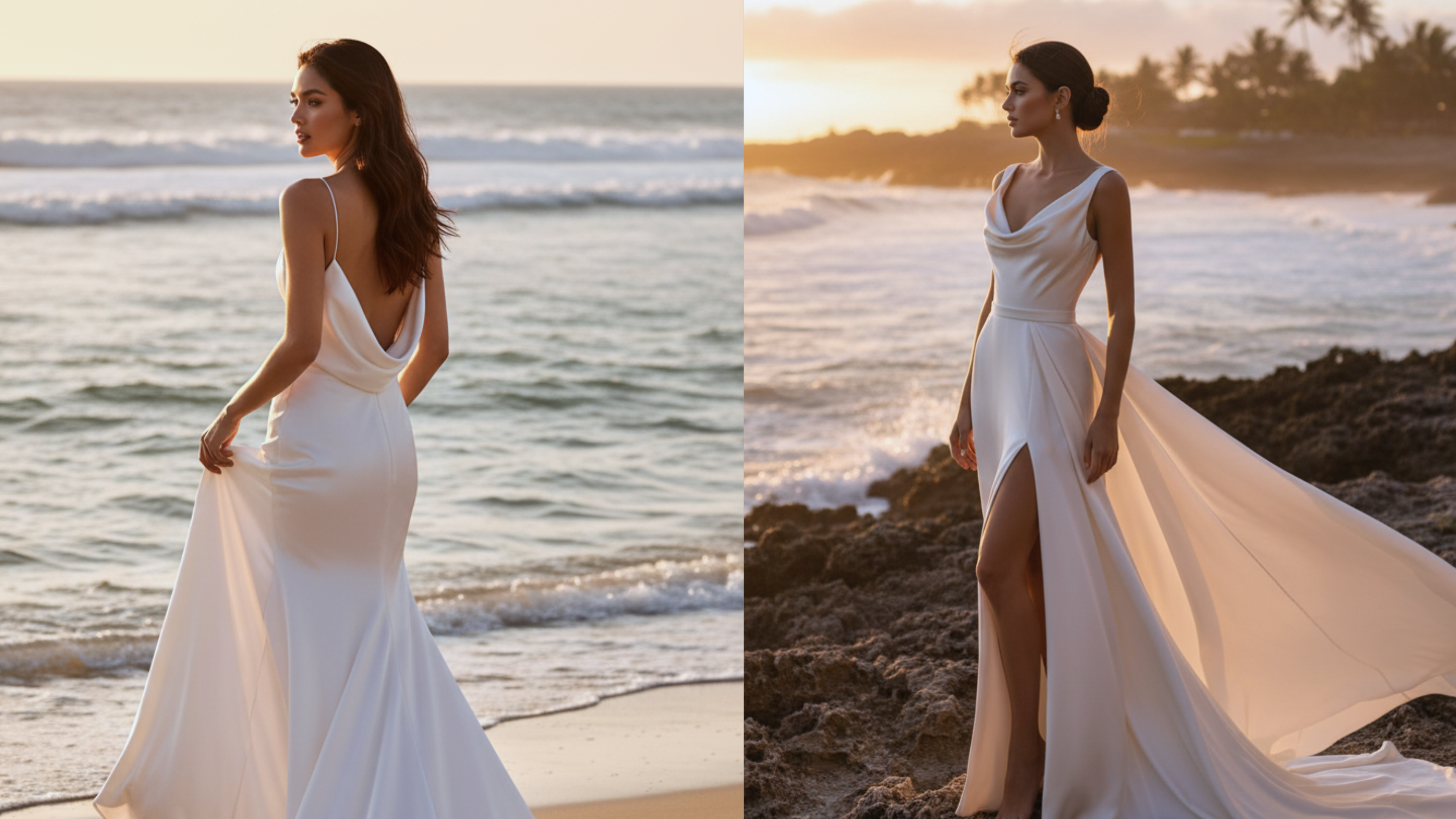 Minimalist brides are loving sheath-style beach wedding dresses for their simplicity and sophistication. These dresses skim the body gracefully and often feature elegant details like cowl necks, halter straps, or low backs. A satin or crepe slip gown gives off that “effortless luxury” vibe, perfect for a sunset beach ceremony. Add pearl earrings or a delicate anklet for a touch of coastal glam.