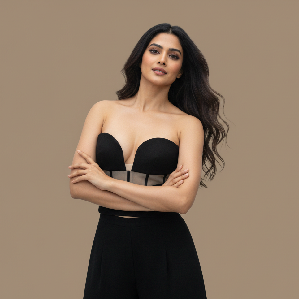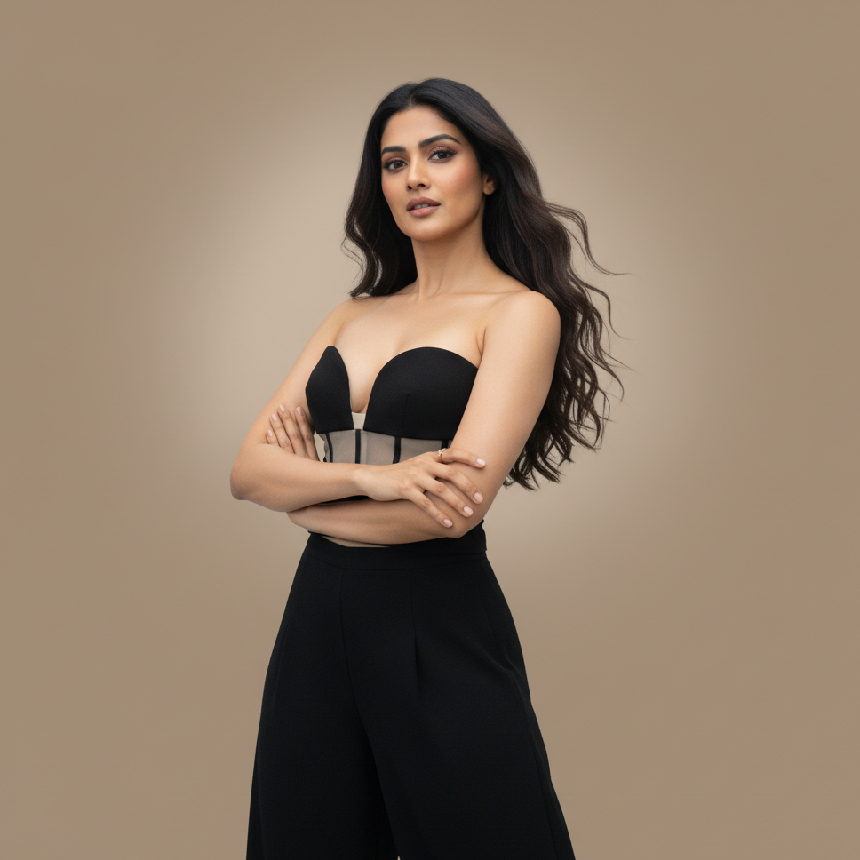 The Aulum is a study in controlled structure and fluid movement, balancing precision corsetry with elongated tailoring. Designed as a modern evening statement, the silhouette fuses a sculpted strapless bodice with high-waisted, wide-leg trousers, creating a look that is sharp, architectural, and undeniably contemporary.