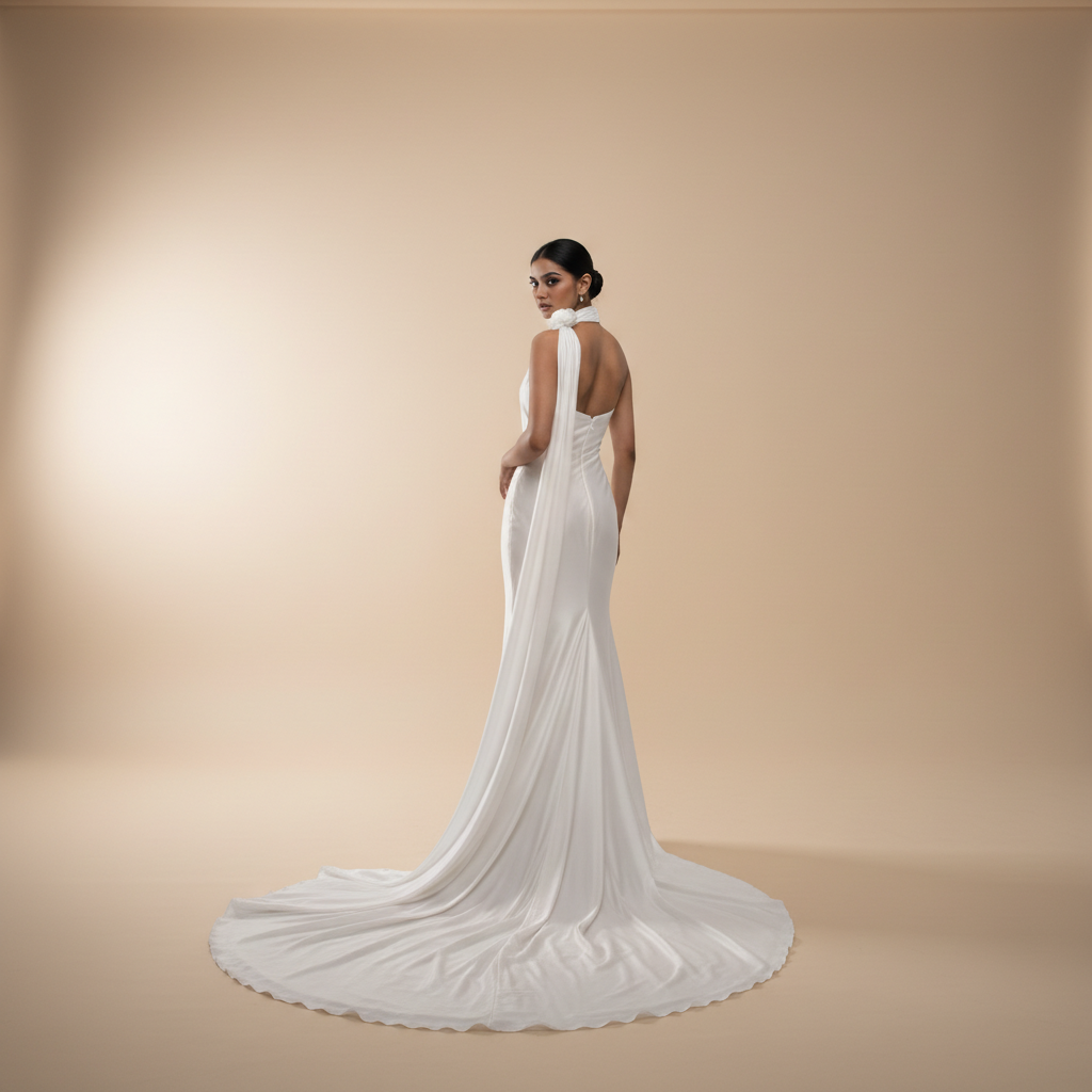 The core of the design is the asymmetrical wrap bodice, which features deep, diagonal pleating that originates at the hip and sweeps upward across the torso. This structural draping is anchored by a precision-boned internal corset, providing a firm, tailored foundation that allows the voluminous, side-swept overskirt to flow dramatically into a substantial train. The result is a silhouette that feels both grounded in technical tailoring and elevated by its fluid, grand proportions.
