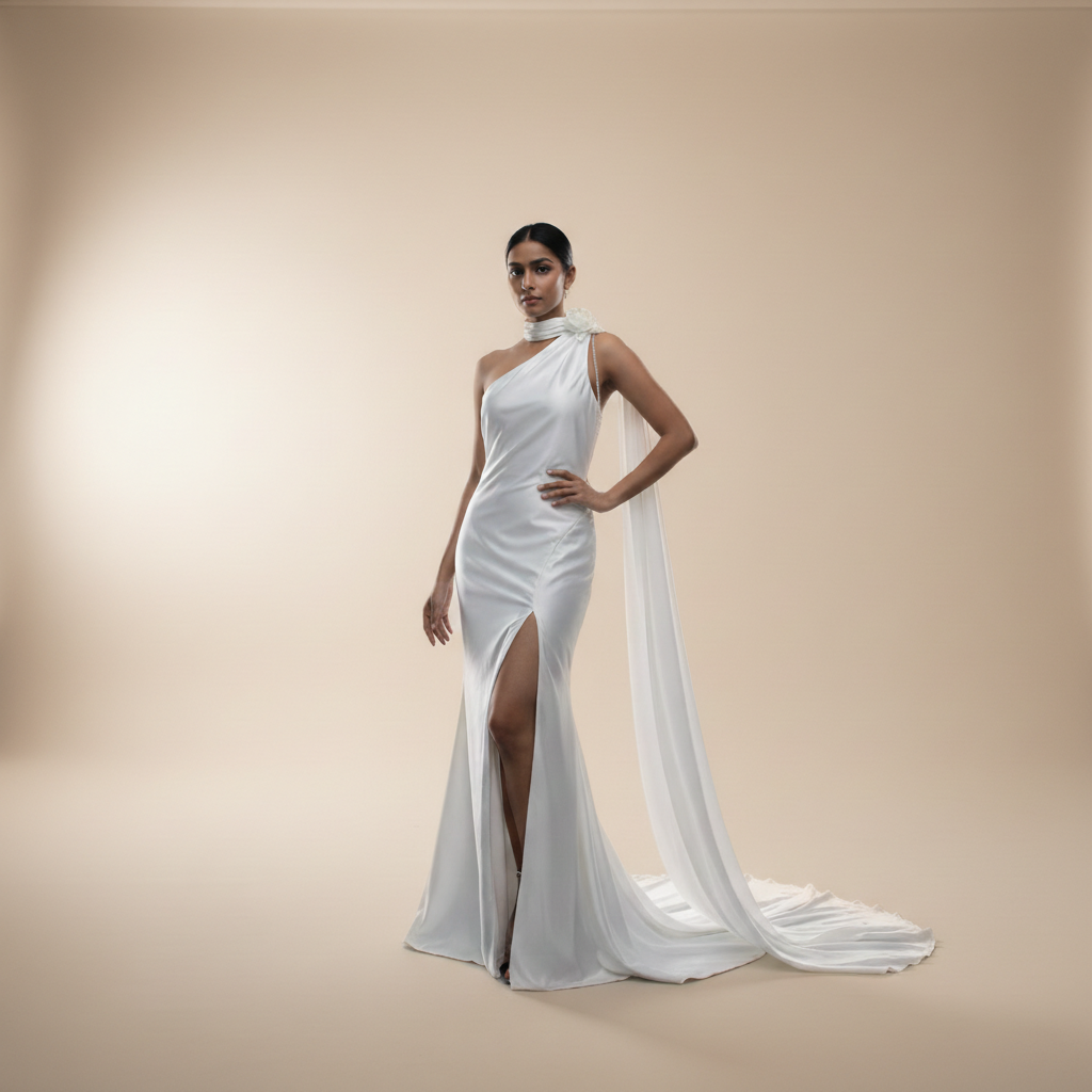 | Silhouette | Asymmetrical with Side-swept Overskirt |