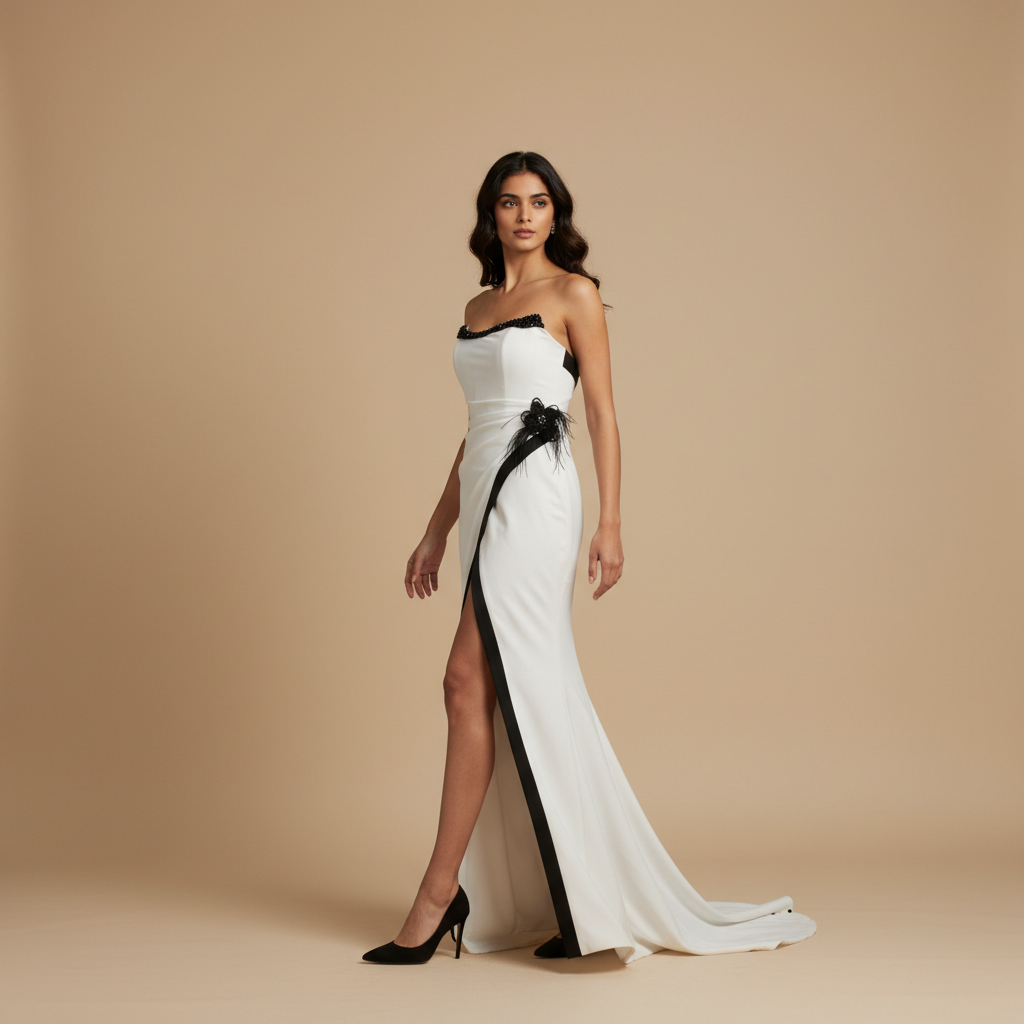 The Nyborg is a high-contrast editorial statement, designed for the woman who seeks a fusion of cinematic glamour and monochromatic precision. This floor-length masterpiece is crafted from a premium milk-white crepe that offers a flawless drape, providing a stark, clean canvas for its bold black accents. The silhouette is a study in verticality, featuring a precision-cut thigh-high slit outlined with a sharp black border that elongates the frame and adds a daring, modern edge.