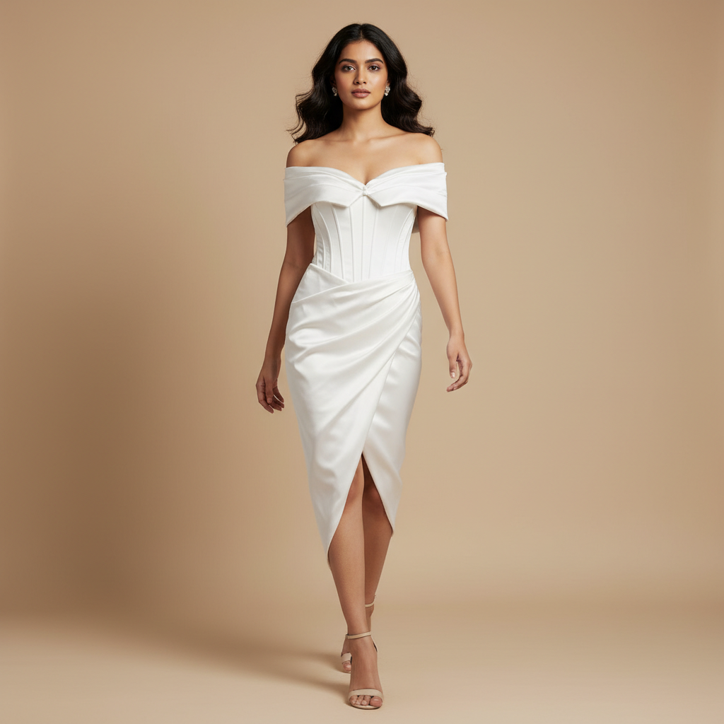 The silhouette is defined by its architectural off-the-shoulder neckline, featuring a wrap-around cuff detail that creates a soft, bow-like focal point across the bust. This sits atop a highly structured corset bodice with visible vertical boning, providing a sharp, tailored contrast to the fluid, asymmetrical tulip skirt. The skirt’s deep, overlapping drapes converge at the waist, creating a dynamic sense of movement and a sophisticated, tapered hemline.